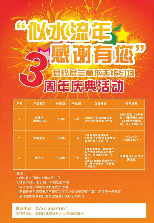 “似水留年,感恩有你”君致君兰高尔夫练习场3周年庆典活动感恩大回馈。
