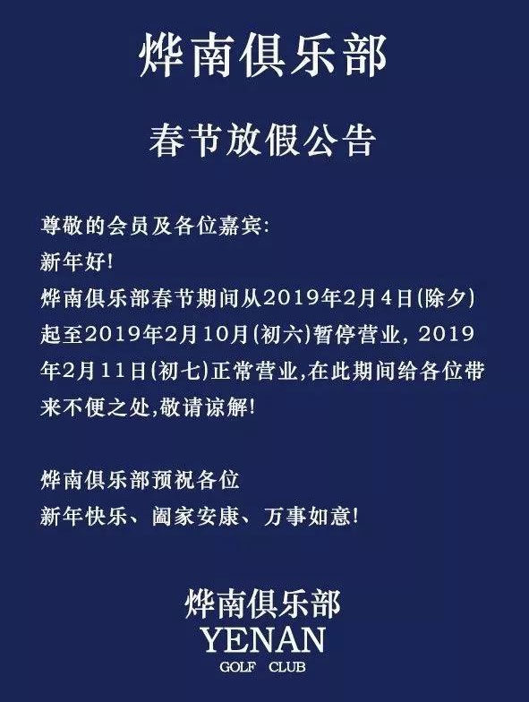 上海烨南高尔夫俱乐部2019春节假期通告,敬请悉知!