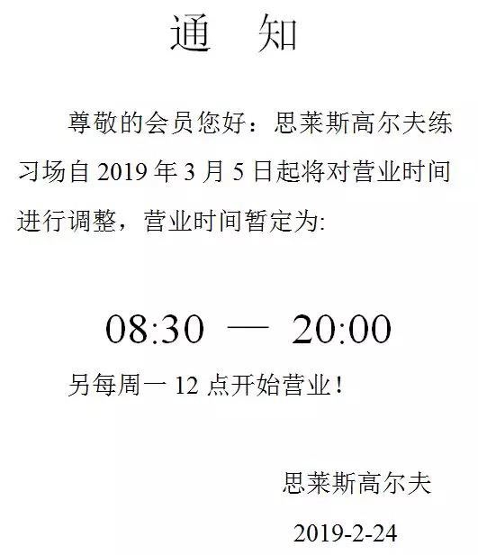 思莱斯高尔夫练习场营业时间调整: