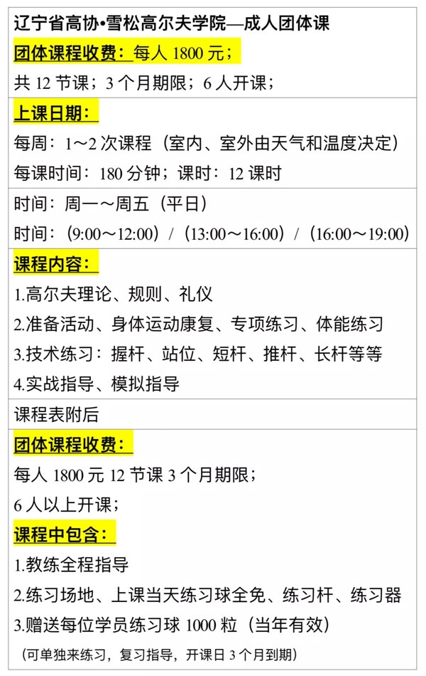 辽宁省高协学院高尔夫学院成人团体课开课啦!6人成团,4人开班。让你轻松学会高尔夫。