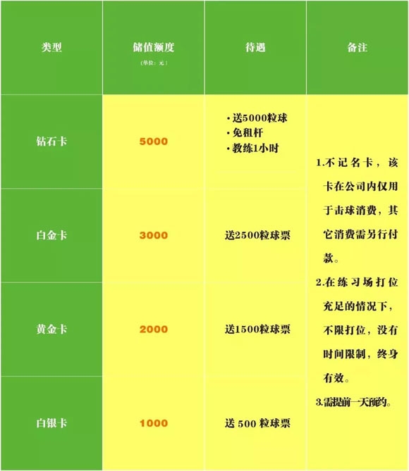 不记名卡,该卡仅用于击球消费,需提前一天预约。送击球、免租杆,高尔夫教学等待遇。