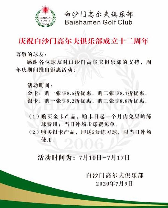 白沙门高尔夫俱乐部十二周年庆特惠!