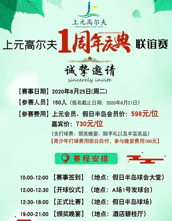 不知不觉中,上元高尔夫走过了一年时间,在此期间感谢各位对上元高尔夫俱乐部的大力支持!借此一周年之际,上元感恩回馈各位客户,将举办上元高尔夫一周年庆典联谊赛,以此为各位会员搭建一个高层次的娱乐、休闲、交流的平台,现诚挚邀请您参加于8月25日(星期二)在碧桂园假日半岛高尔夫球会举办的上元高尔夫一周年庆典联谊赛。