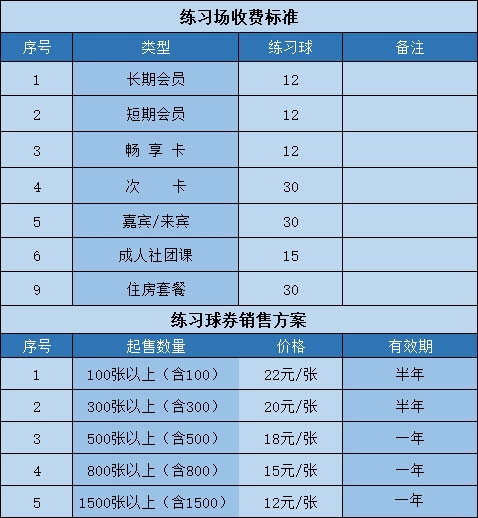 因物价上涨、人工成本增加,为保证球场良性运营,持续给您提供更好的服务,球场决定自2020年11月1日起调整练习球击球价,具体方案如下,衷心感谢您的理解。