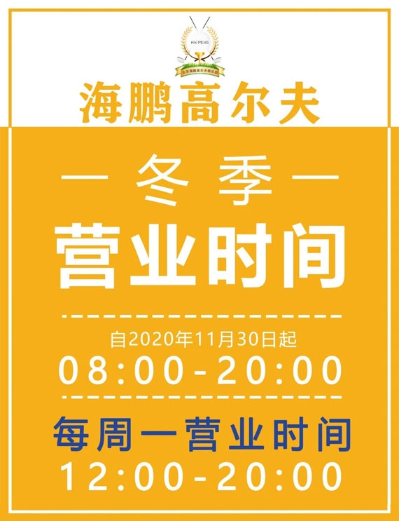海鹏高尔夫俱乐部自2020年11月30日起将调整为冬季营业时间,面朝阳光高球暖冬尽在海鹏。