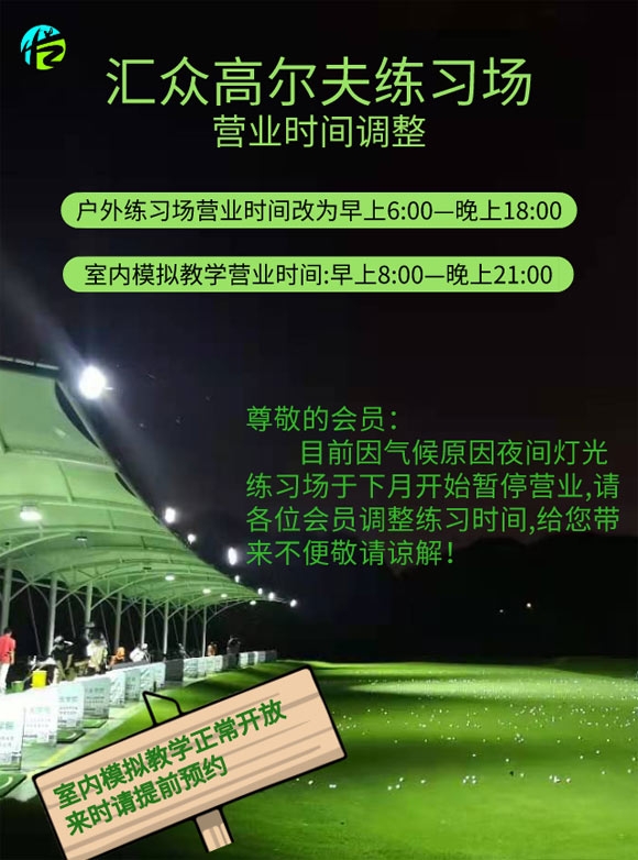目前因气候原因夜间灯光练习场于下月开始暂停营业,请各位会员调整练习时间,给您带来不便敬请谅解!