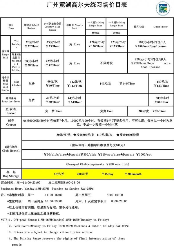 广州麓湖高尔夫练习场存包费价格调整