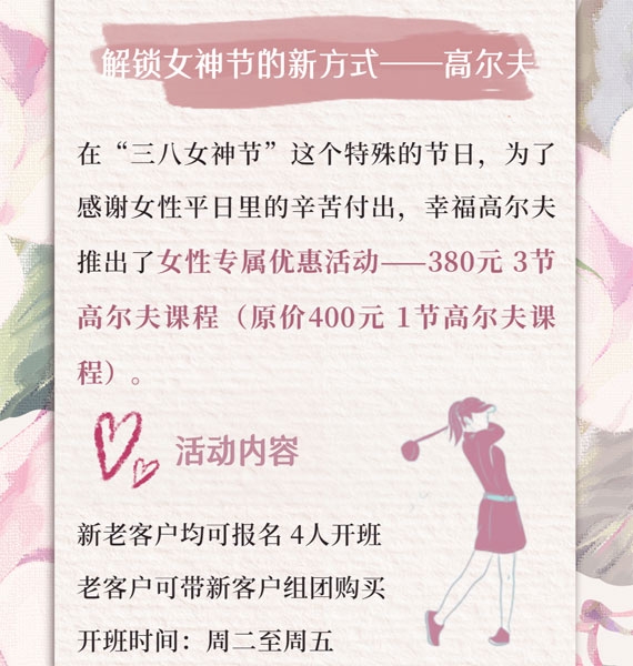 【幸福节日】今日幸福,女神专属“380元 3节高尔夫课程”