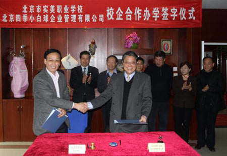 四季小白球与实美职校双方本着资源共享、优势互补、平等互利、共同发展、实现共赢的原则,强强联合进行校企之间的全面合作。双方合作开办的高尔夫专业培训中心初步设定学制三年,开设从事球场服务的职业球童、教练员、裁判员、球场草坪的维护与保养四个专业。