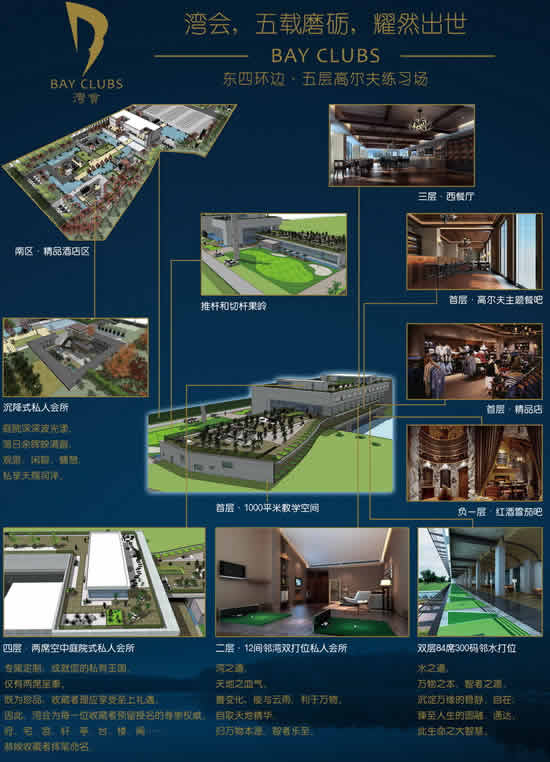 “湾会”高尔夫俱乐部座落在北京城内繁华尊贵的CBD地区-四惠地段,建筑面积阔达3万1千平方米的俱乐部会所拥有室内外高尔夫练习场(84个打席)、高尔夫学院(4间VIP教室)、12个VIP高尔夫练习包间、4个配备打位的联排别墅式会所、20个高尔夫模拟器包间、体育主题酒吧、酒窖、雪茄吧、健身会所、室内阳光泳池、SPA会馆、独立式私人会所,以及拥有20间风格迥异房间的精品酒店,并配有多个格调高雅的中西餐厅及配置完善的康体设施。