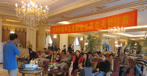 2011年5月28日上午9点半,由中海半岛物业组织的“半岛业主独墅岛高尔夫训练营活动”在中海独墅岛现场举行。 中海独墅岛坐落于独墅湖南、墅蒲塘东,直面11.52万方烟波浩瀚独墅湖。独墅湖北接金鸡湖、南接吴淞江,湖面浩淼,清澈迷人,稀缺湖景为姑苏城内罕见。中海独墅岛水上高尔夫场地位于独墅湖畔,来宾可在尽情挥杆的同时尽享旖旎湖光水色。 活动伊始,别开生面的高尔夫知识讲座在来宾的关注下首先举行。中海独墅岛特邀请资深高尔夫教练为来宾讲解高尔夫运动,让来宾了解高尔夫的发展历程、各类球杆及其正确使用方式、高尔夫比赛的评判标准等知识。在场嘉宾对讲座内容兴致尤佳,不少来宾纷纷向教练提问,以深入了解高尔夫运动。 中海独墅岛除提供高尔夫专业讲座外,还为来宾精心准备了丰富可口的冷餐,让来宾享受宾至如归的至尊生活感受。 讲座结束后,在中海独墅岛现场工作人员的指引下,来宾齐聚水上高尔夫场地品味湖岛高尔夫。高尔夫教练现场指导来宾挥杆、击球,来宾兴致勃勃,都纷纷一试身手。一时间,中海独墅岛高尔夫场地热闹非常,激情弥漫。