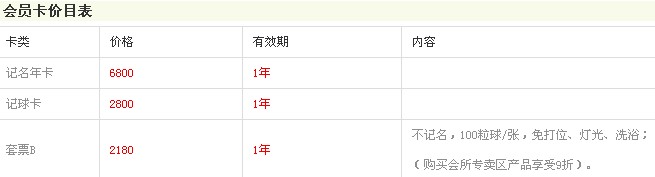 基本收费: 练习场: 20/盒 灯光费: 20/小时 租杆费: 30/支 果岭练习: 40/小时 VIP房: 180/小时