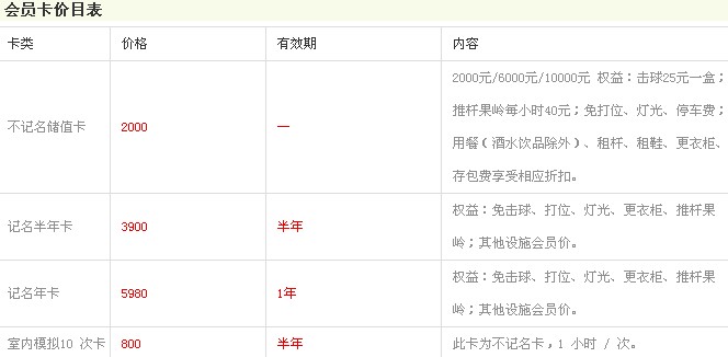 基本收费: 练习场: 30/30粒 租杆费: 50/支 果岭练习: 50/小时