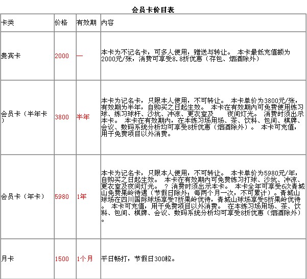 基本收费: 练习场: 20/30粒 灯光费: 5/位 租杆费: 20/支 存包费: 100/月 教练费: 300/小时