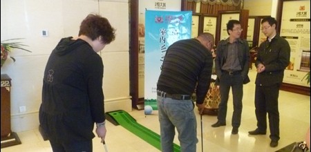 2011年10月15日下午2:30分,在普通人眼里,高尔夫作为一项高贵的运动,可望而不可即。可是你不曾想到,“旧时王谢堂前燕”也有“飞入寻常百姓家”的一天。位于长江东路与吴敬梓路交汇处的恒大售楼部举办的“室内MINI高尔夫精英邀请赛”让普通购房者们也体验了一回高尔夫的乐趣。