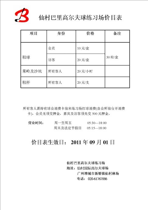 广东仙村巴里高尔夫球练习场价目表