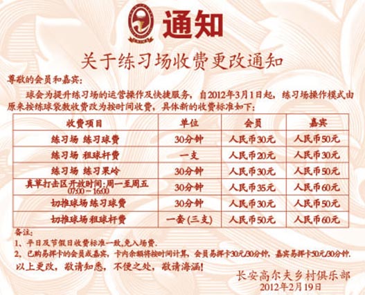 东莞长安高尔夫练习场收费更改通知
