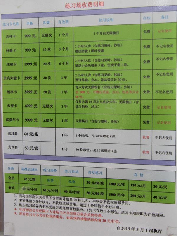 山东青岛国际高尔夫练习场2013年收费价格