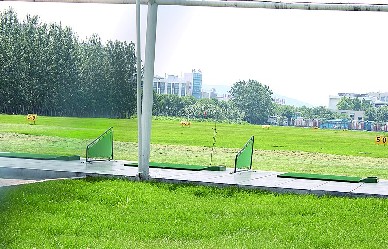 6月13日11:00前后,在齐鲁工业大学学生的指引下,记者找到位于该校东侧的这片场地。场地有数个普通足球场大小,草皮上立着标示距离的黄色牌子,几间简易房前面,建有一排遮雨棚,下面有约20个练习位。相比正规大型高尔夫球场,这块场地显得有些简易。一旁放着几张竹椅,四五名年轻人在练习打球。