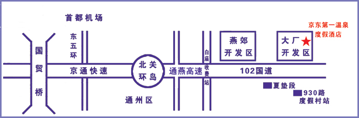 北京方向自驾车:北京三环、四环、五环,从东环上京通快速路(三河方向)—穿过西马庄收费站—进入通燕高速路—穿过白庙收费站—进入燕郊102国道穿过彩虹桥继续向东13公里路北。(提示:京通快速路、通燕高速都是城区高速,中途不用下任何出口。从东三环到京东第一温泉度假村约40公里;进入燕郊左侧有广告牌提示)