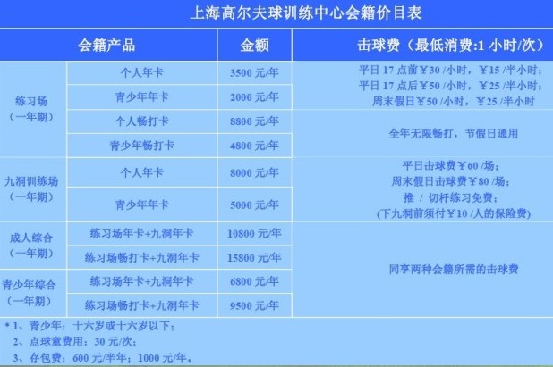 上海市高尔夫球训练中心会籍价目表