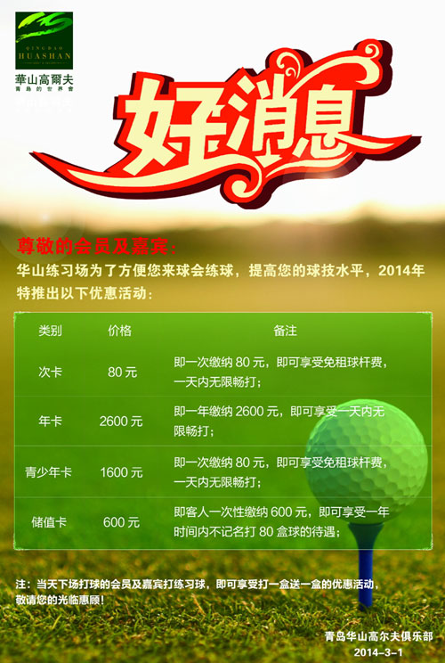 80元/次 青岛华山高尔夫练习场2014年畅打优惠