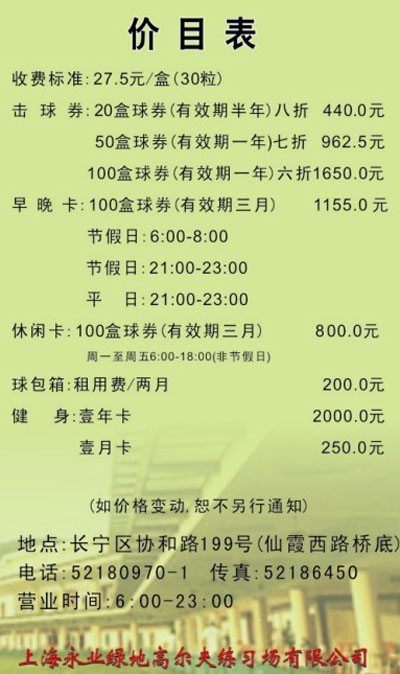 上海仙霞高尔夫练习场(永业绿地)价格表