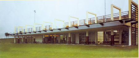 造型简洁、明快极富现代感的红鼎高尔夫练习场,共设有32个练习打位,分上下两层;夜间有泛光灯照明。