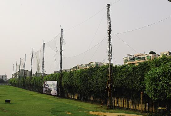 高尔夫练习场与小区一墙之隔,墙上的防护网经过风吹雨淋,出现很多破损。