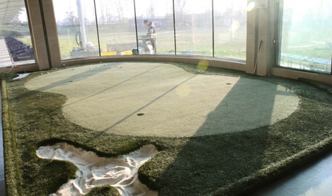 •果岭推杆练习:在球洞周围非常平坦的区域,这个区域的草很特殊,有利于选手将球推到洞中。虽然只是轻轻的将求推进洞中,也是很需要技巧的!