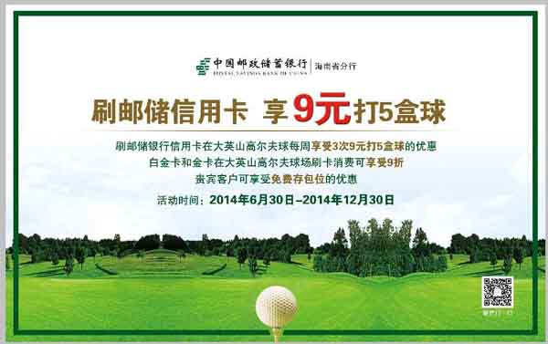 2014年6月30日-2014年12月31日期间,持邮储信用卡,到海口到大英山高尔夫球场, 皆可享受优惠服务。