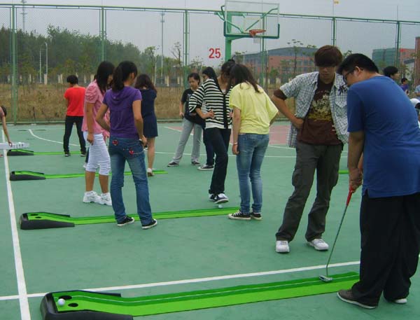 为了不断满足学生对现代体育项目学习愿望的需求,2012年起, 体育教学中心孙天明教授从本学期开始,新开设并亲自教授“高尔夫—一杆进洞”课程,受到了学生的欢迎,目前每周6个班的教学时间内,每班45人的名额,全部被学生选满,还有很多学生因名额限制而暂时未能够满足愿望,纷纷表示下次一定设法抓紧选上该项目,过把“高尔夫”瘾。