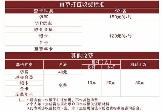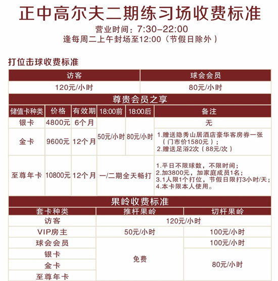 日前,结合客户反馈以及练习场的具体运营情况,正中高尔夫练习场已对一二期价格进行重新调整,并正式对外公示。新的练习场价格及套卡种类都有相应的调整,其中: