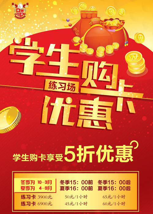自2月1日起,西海岸高尔夫球会学生购买练习场优惠卡五折优惠!限在校学生,年龄在8-23岁,凭学生证即可购买。