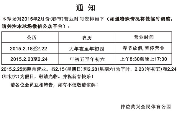 上海仲益黄兴高尔夫练习场2015春节营业时间安排