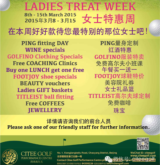 在即将到来的三月中好好款待您生命中最特别的女子或者您最宝贝的女儿吧! 针对各个年龄段的每位女士我们都是适合她们的礼物或活动,包括教学课程、珠宝首饰、球杆定制、礼品篮、免费咖啡、服装特惠等等。三月快来看一看吧!