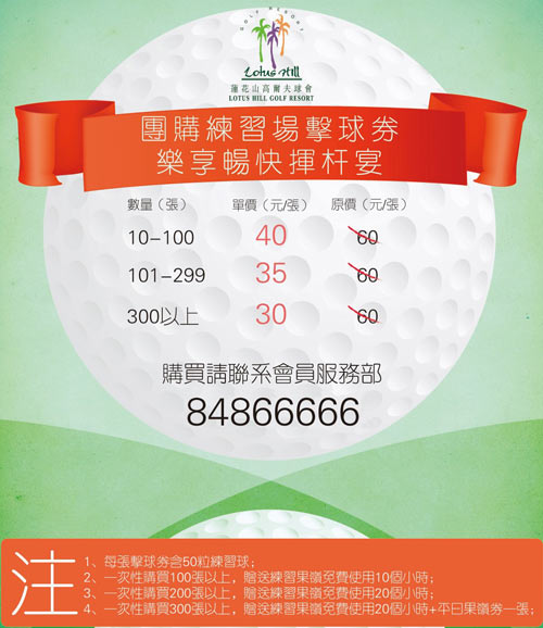 放下繁重的工作,走出雾霾下的城市,来一场酣畅淋漓的挥杆宴,在这鸟语花香的季节。一项与自然亲近的运动,一段让你身心愉悦的时间。 莲花山高尔夫球会推出练习场击球券团购套餐,更多优惠,更多惊喜!