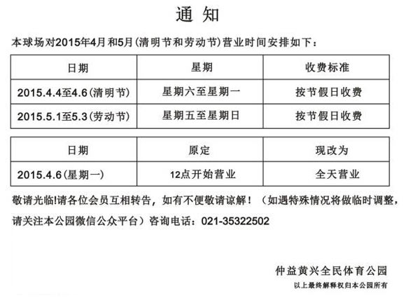上海仲益黄兴高尔夫清明节和劳动节营业时间安排