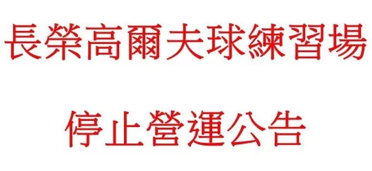 接获政府通知: 长荣体育娱乐高尔夫练习场将停止营运,进行整改,并于2015年5月18日星期一起,全面停止对外开放。 会员权益将另行通知。 如有疑问请洽长荣体育娱乐一楼前台, 或致电(0769)8843-2996#600 造成不便,敬请见谅。