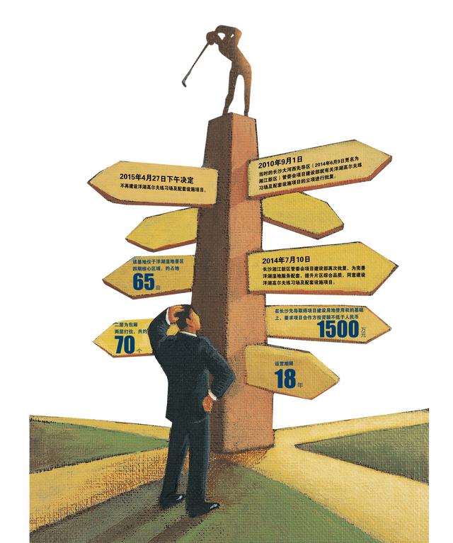 2014年7月10日,湖南湘江新区管委会项目建设部再次批复,为完善洋湖湿地服务配套,提升片区综合品质,同意建设洋湖高尔夫练习场及配套设施项目。不过,记者发现,与2010年所发的同样一个项目立项批复所不同的是,后来的批文只说明项目位于洋湖生态湿地修复与保育工程内,而并没有提及具体选址的道路范围。