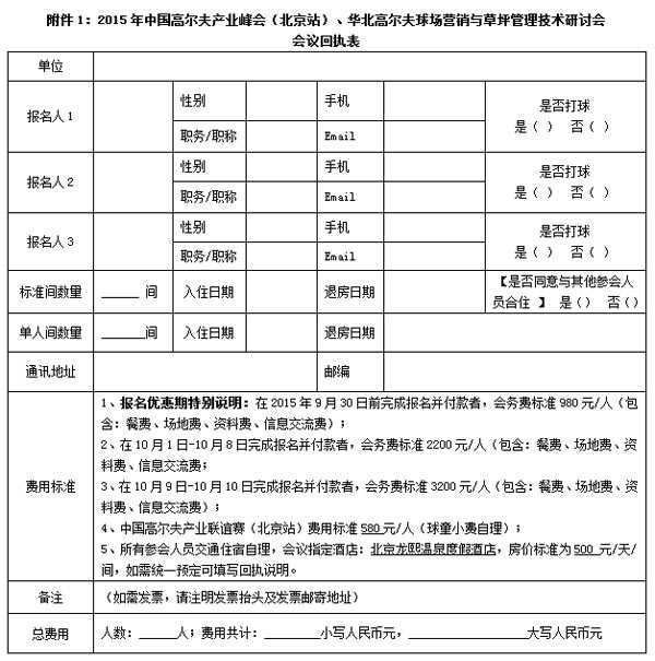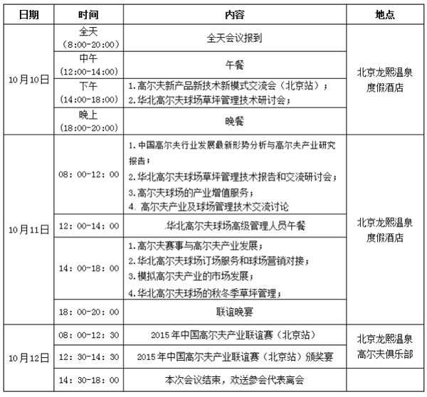 2015年是我国高尔夫行业发展极不平凡的一年,高尔夫相关企业都存在着一定的压力和挑战。为了进一步推进中国高尔夫产业的健康发展,为了打造一个高尔夫产业全方位服务的大众平台,为了更好地促进华北地区高尔夫行业的市场对接和产品营销,及时分享交流华北地区高尔夫球场养护管理的专业经验和技术,进一步提高华北地区高尔夫球场设计建造与管理水平,加强华北地区高尔夫产业界和全国各地区球会职业经理人及高尔夫产业界的交流与合作,现决定于2015年10月10日-12日在北京召开:2015年中国高尔夫产业峰会(北京站)、华北高尔夫球场营销与草坪管理技术研讨会, 会议通知如下: