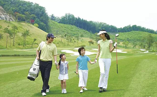 韩国高尔夫球场上的一家人