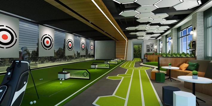 本设计为室内高尔夫模拟训练场及运动休闲中心,给工作繁忙的商务人士因平时没有时间下球场打球,提供一个练球,球友交流球技,健身交友场所。打位训练场绿色柔软的草皮,周边逼真的景观以及虚拟体感模拟高尔夫的精致3D画面,邀您身临其境,体验真正优雅的高尔夫运动,高尔夫工坊为球手提供量身订做球杆,球具诊断、维修和调整,现代简约、清新自然的培训沙龙室是专业的讲课以及球友分享交流球技的场地,造型优雅的休闲区给球友运动后提供一个温馨舒适的休息、交友、商务洽谈氛围,球友在练完球后去可以健身区健身,在忙碌的工作后享受身心的畅快淋漓。本案风格采用LOFT工业风,裸露的天花、深灰色的涂料和金属、浅绿色的草皮地面、配以颜色艳丽的家私配饰做点缀,营造出柔和轻松的氛围。
