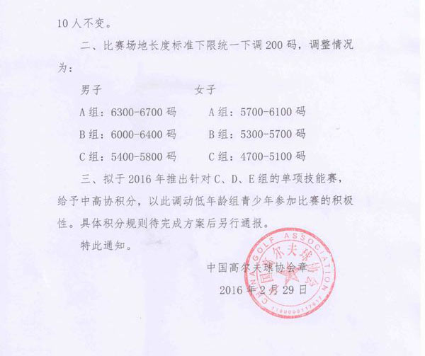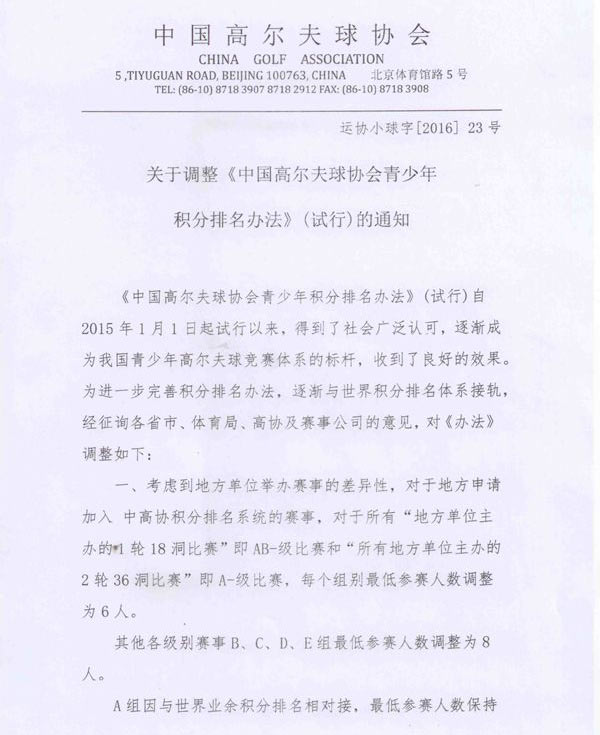 《中国高尔夫球协会青少年积分排名办法》(试行)自2015年1月1日起试行以来,得到了社会广泛认可,逐渐成为我国青少年高尔夫球竞赛体系的标杆,收到了良好的效果。为进一步完善积分排名办法,逐渐与世界积分排名体系接轨,经征询各省市、体育局、高协及赛事公司的意见,中高协对《办法》作出以下调整。