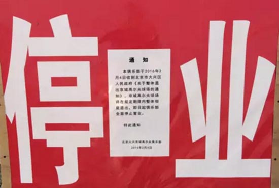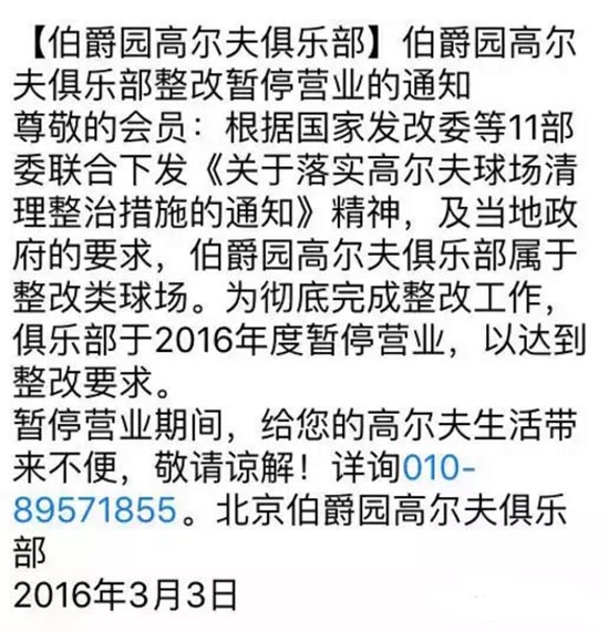 距离昨天晚上小编发出消息“突发!北京又一家高尔夫球场被强制拆除”,不到12个小时,又传出一家高尔夫球场停业的消息。北京加州水郡高尔夫球会并不是昨天唯一一家发出停业通知的球场,有消息称:同一天,位于北京通州的伯爵园高尔夫球场也发出了停业通知。