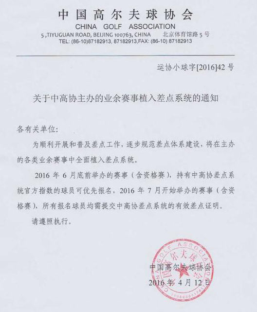 北京时间4月13日消息。中国高尔夫球协会昨日发布公告,宣布将在主办的各类业余赛事中全面植入差点系统。公告全文如下: