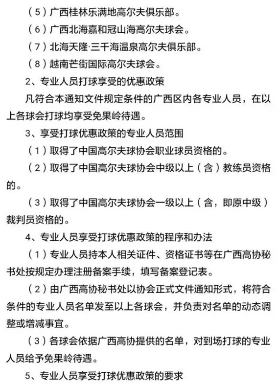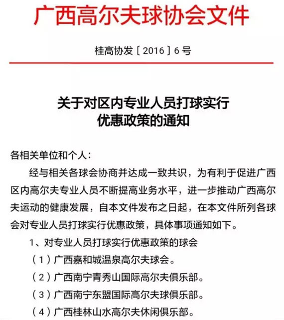 广西高协对区内专业人员打球实行优惠政策的通知