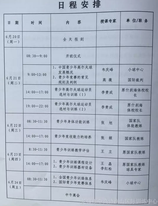 本次培训将从6月21日一直持续至6月24日,来自全国各地的百余名教练将接受青少年体能、技能、青少年身体功能训练、青少年竞技能力培养、青少年训练教学评估等全方位培训,为青少年高尔夫的培养寻找更好的方式。