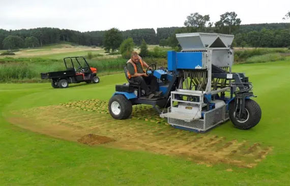 此外,高尔夫草坪反交播应选择优良的狗牙根、结缕草等暖季型草坪草种及其品种进行播种。播种时间一般选择气温达25~30℃时进行。高尔夫草坪打球次数多、利用频繁的情况下,播种量应适当增大。高尔夫球场球道区草坪一般播种量为15~25 g/m2,可采用播种机进行播种作业,为使播种更加均匀,可采用垂直交叉两次播种。播种后一定要有充足的水分供应,以保证种子正常萌发和迅速生长;播种后高尔夫草坪必须加以保护,避免遭到践踏。