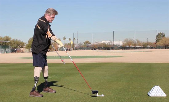 在此,我还不得不炫耀下我们解决问题的能力。一位叫Jeff Lewis的四肢均被截肢的高球爱好者找到我们,问我们能否帮他重新回到球场打球。没什么能难倒我们。我们通过将球杆接入他右边的假手臂,让他重新能打球了,如下图所示。我们还利用弹簧发明了一套特殊的机械装置,使他得以迅速更换球杆。我们已将该项发明发表至Journal of Sports Engineering杂志,希望该项机械装置也能获得更多其它方面的应用。